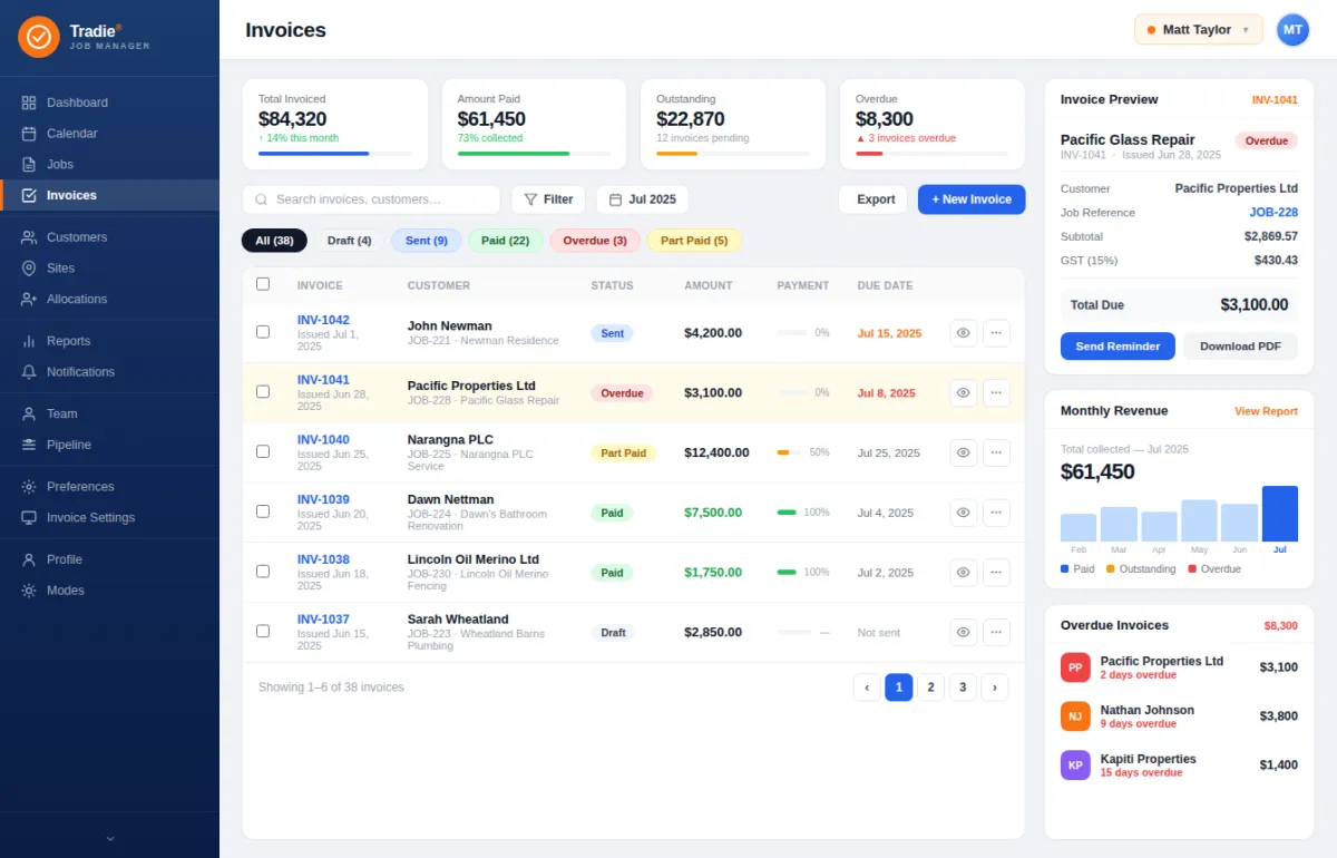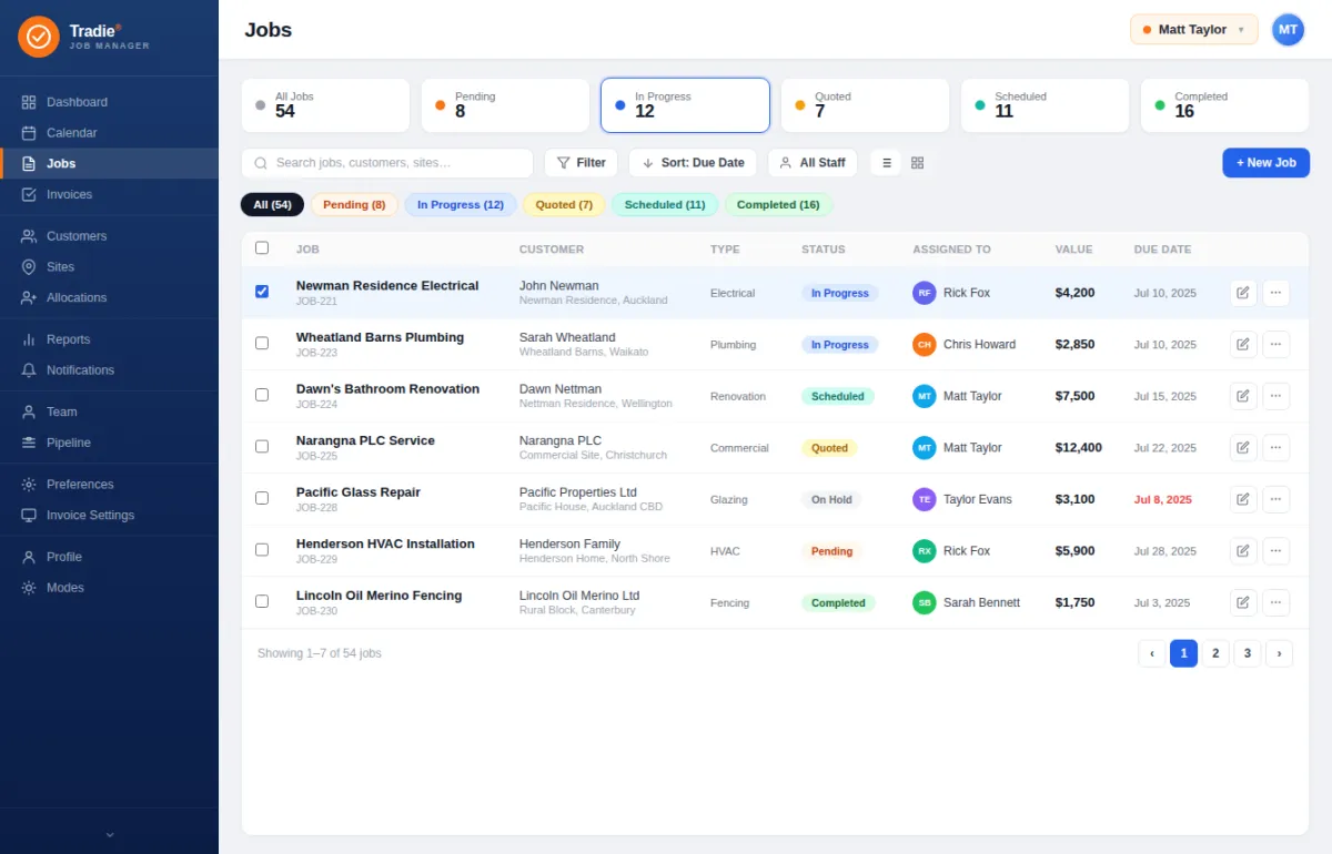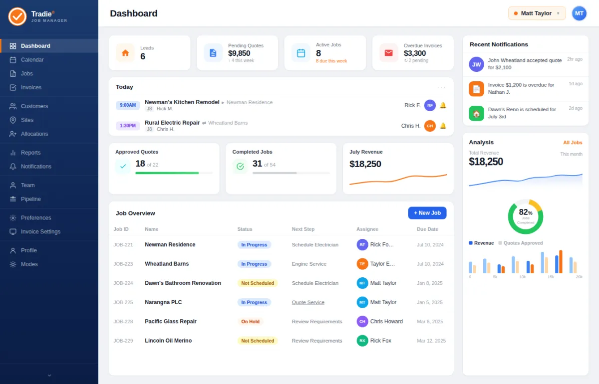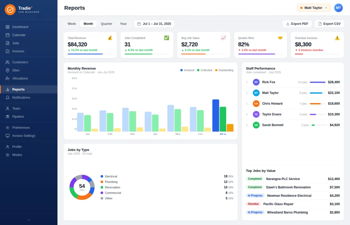 By reducing manual paperwork and duplicated data entry, the system lowers administrative overhead and staffing costs. Built-in job tracking minimises missed quotes, forgotten invoices, and costly scheduling errors. Better visibility of labour, materials, and job progress helps tradies protect profit margins and avoid budget blowouts.