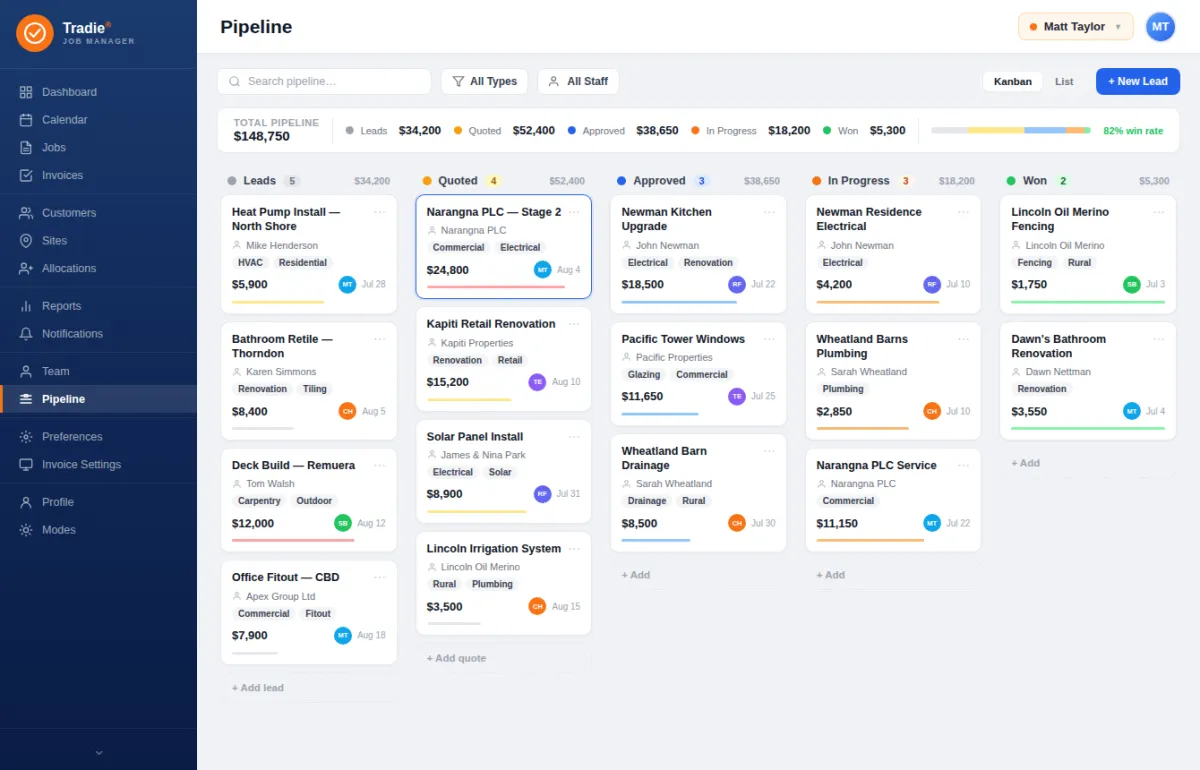 The platform connects the entire workflow — from enquiry and quoting to scheduling, invoicing, and job completion — in one seamless process. Once a quote is approved, it converts directly into a live job, eliminating double handling. With everything tracked in one system, tradies gain clearer communication, faster approvals, and smoother project delivery.